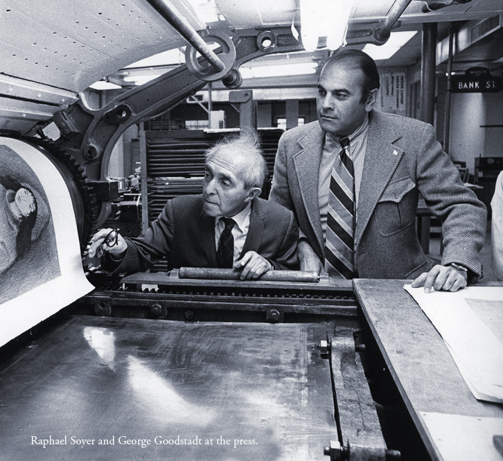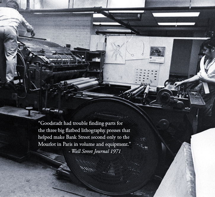 Much of the works we have published are limited edition lithographs and etchings printed at Bank Street Atelier in New York City, the renowned print shop founded by George in 1969. Bank Street proved to be one of the premier printing studios in the city at that time and became a major graphic center, where many of the American Modern Masters came to experiment on the large stones and print their work on the three old genuine flatbed presses. They were helped by the many master printers working there.